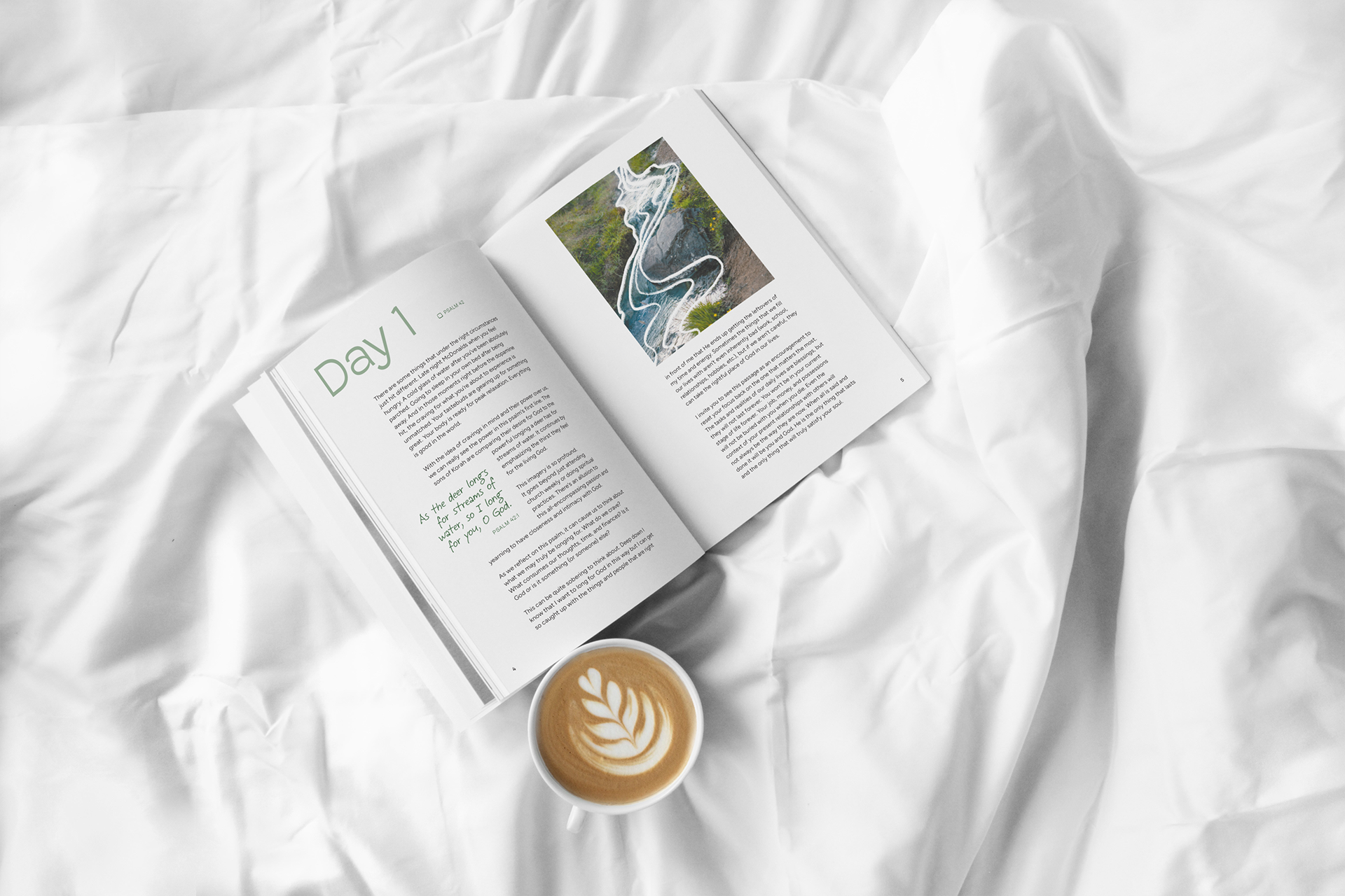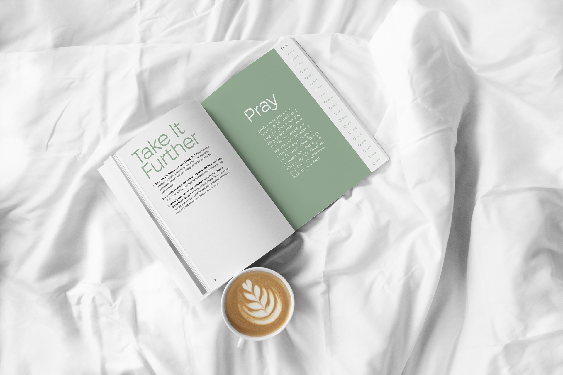 An interactive, 20-day devotional designed to help young adult users track their progress, stay consistent, and follow through on their faith-related intentions day by day. In the busyness of life, design elements in this publication seek to provide a mental resting place that users look forward to engaging with.