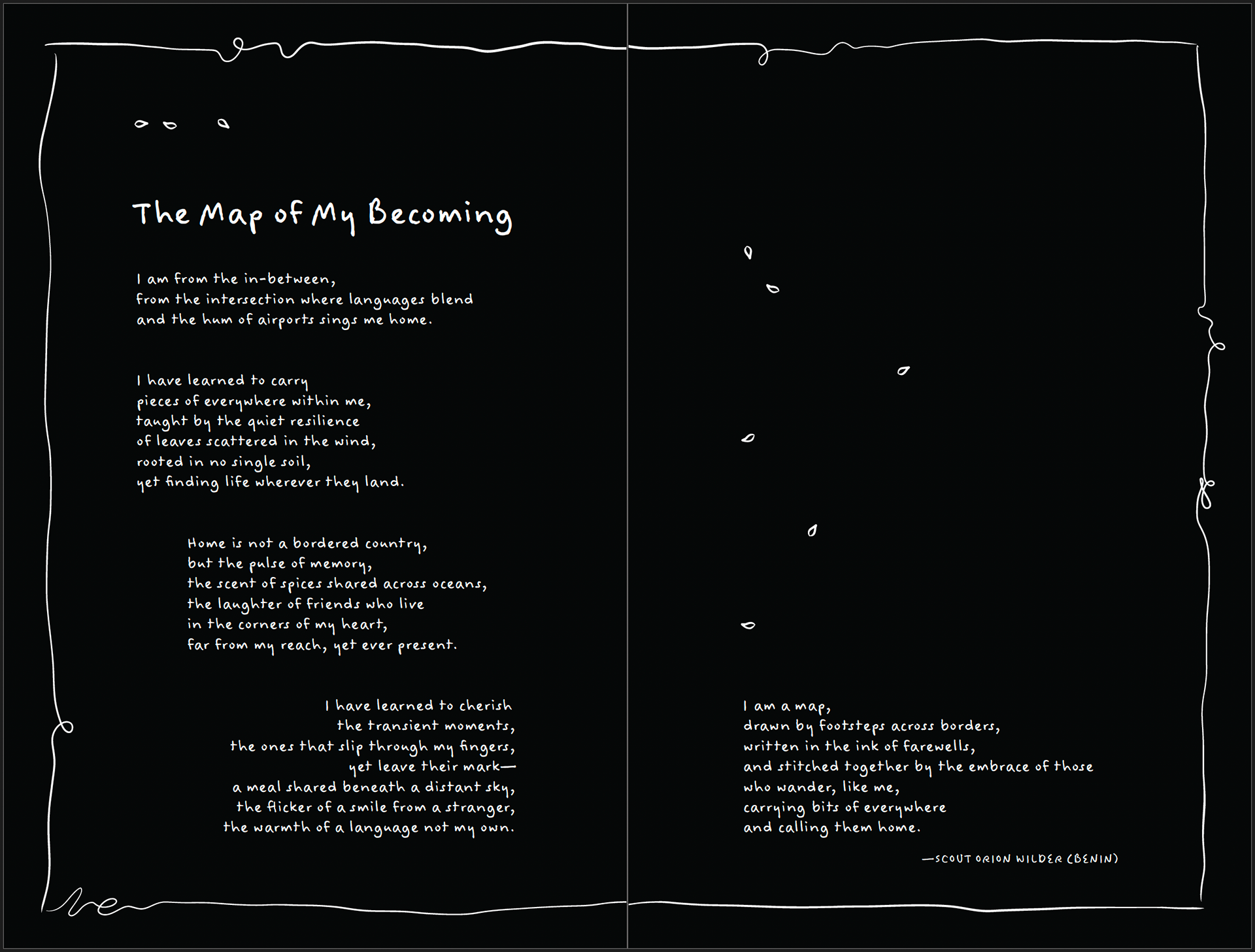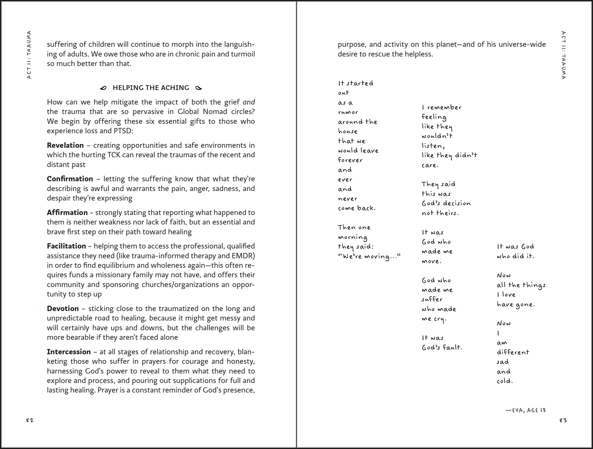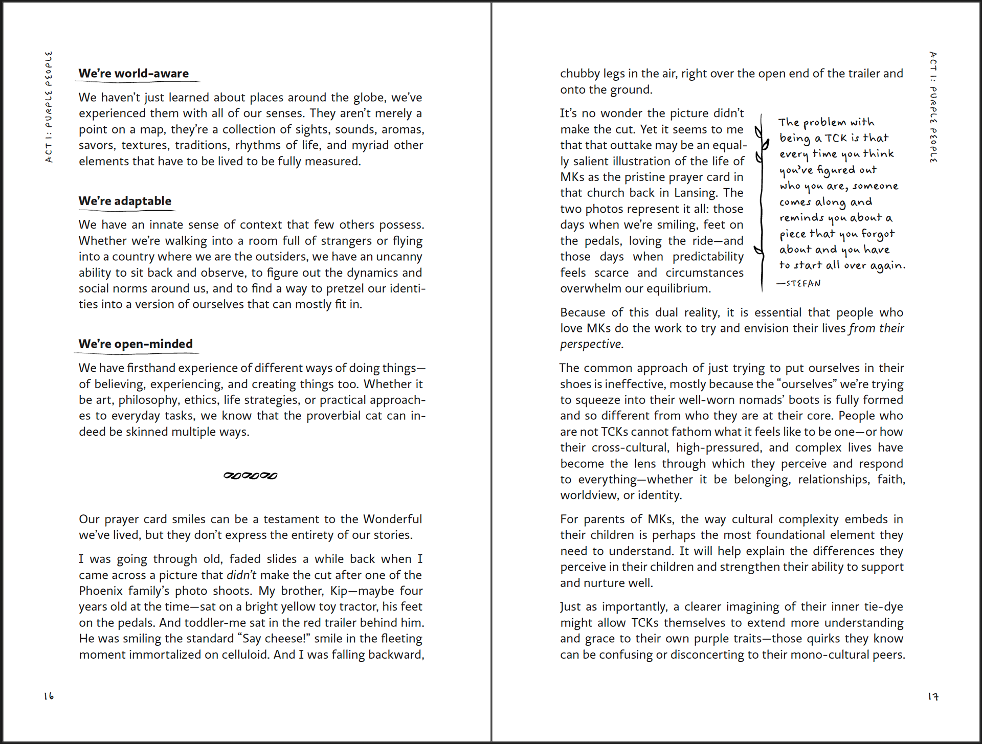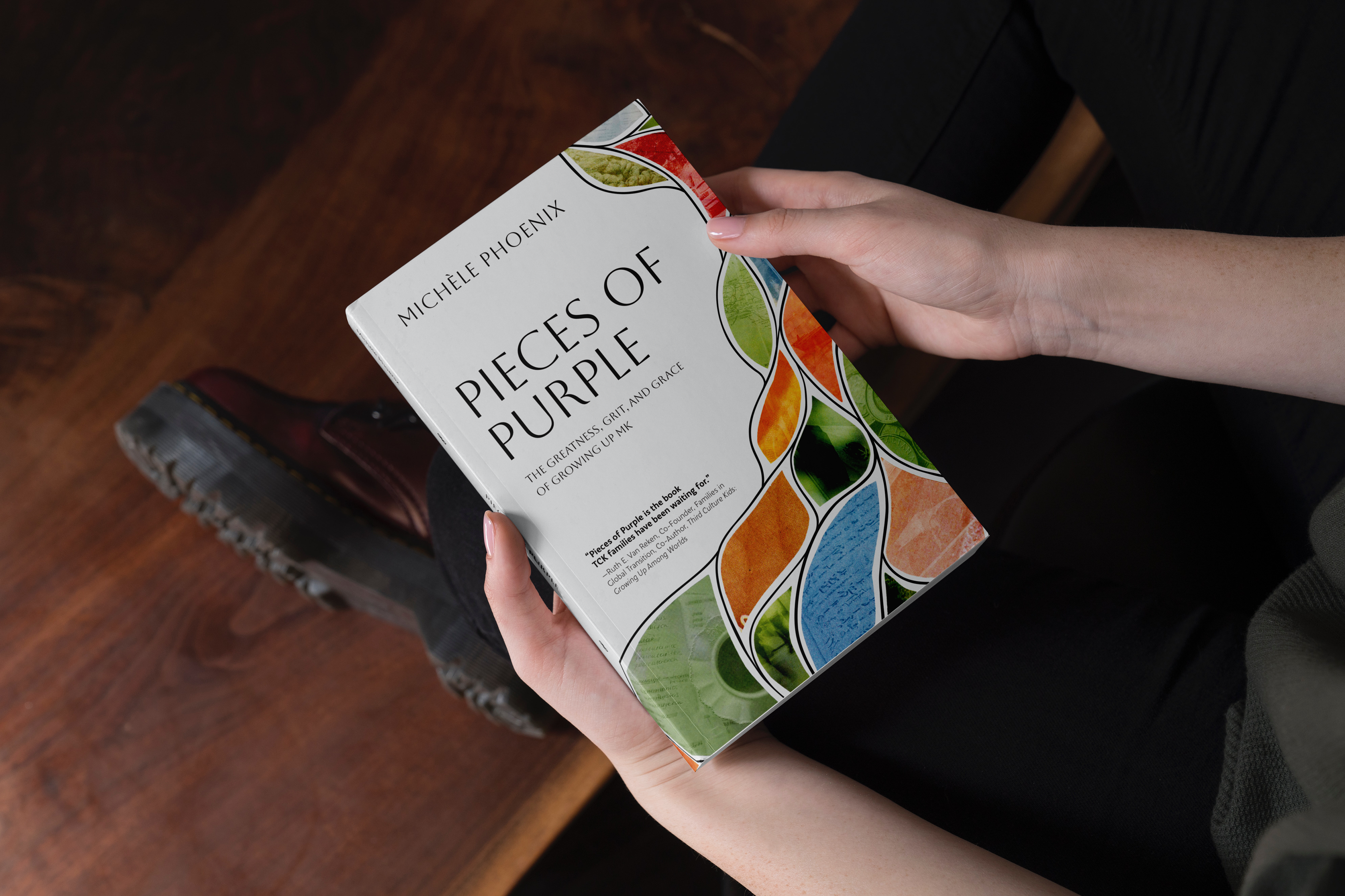 The motif of a leaf acts as a throughline in this design, finding initial life on the cover in multi-media collage. Collage felt right for a book about childhood "pieces." Michèle and I decided to avoid the colour purple to drive home this point: the true essence of "purple" in a TCK context is less about looking a specific way and much more about deeper mixing, flow, and movement - all themes embedded in the cover graphic and carried throughout the book.